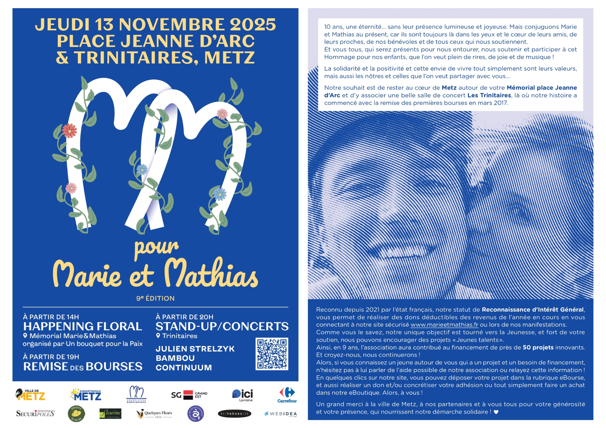 10 ans, une éternité … sans leur présence lumineuse et joyeuse. Mais conjuguons Marie et Mathias au présent, car ils sont toujours là dans les yeux et le cœur de leurs amis, de leurs proches, de nos bénévoles et de tous ceux qui nous soutiennent. Et vous tous, qui serez présents pour nous entourer, nous soutenir et participer à cet Hommage pour nos enfants, que l’on veut plein de rires, de joie et de musique ! La solidarité et la positivité et cette envie de vivre tout simplement sont leurs valeurs, mais aussi les nôtres et celles que l’on veut partager avec vous … Notre souhait est de rester au cœur de Metz autour de votre Mémorial place Jeanne d’Arc et d’y associer une belle salle de concert Les Trinitaires, là où notre histoire a commencé avec la remise des premières bourses en mars 2017.